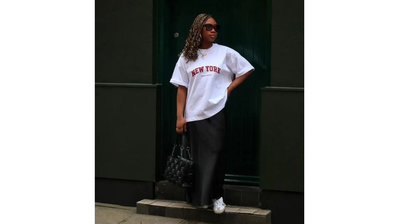 Oversized White Shirt, Satin Black Skirt, and Adidas Samba